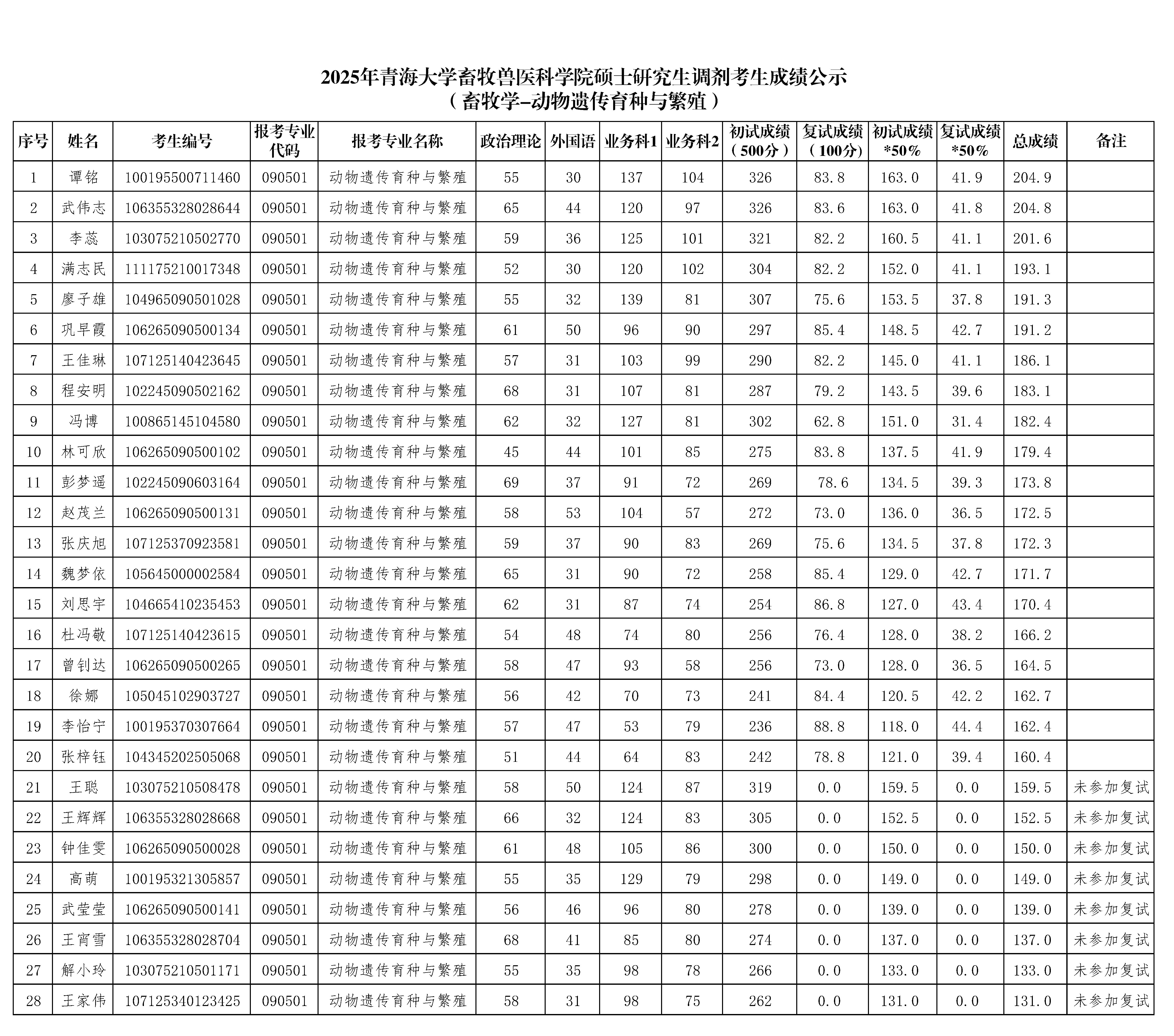2025年williamhill威廉希尔官网畜牧兽医科学院硕士研究生调剂考生成绩公示(畜牧学-动物遗传育种与繁殖)